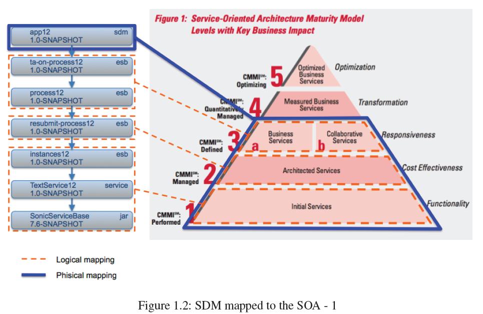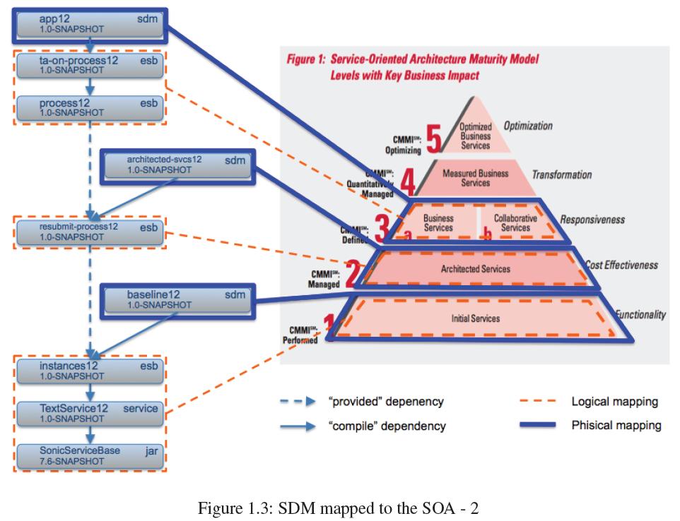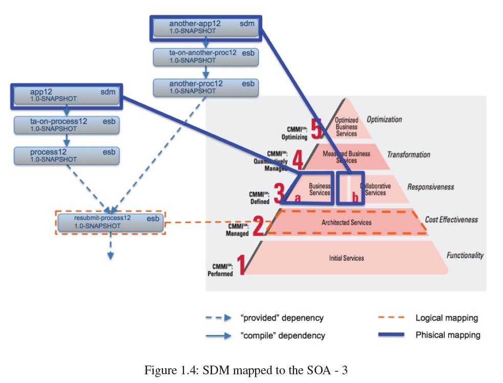 In a large project it would be desirable to have a physical mapping for each layer, and, moreover, for the last layer, the business layer, a SDM model for each business application in order to have a different life cycle for each business application. Using provided dependencies it is possible to define cut points in the dependency graph and limit the contents of the generated SDM model. Now in order to define all the SOA stack a single SDM model is not enough and a model for each layer is needed. These concepts are shown by the figure "SDM mapped to the SOA - 2".